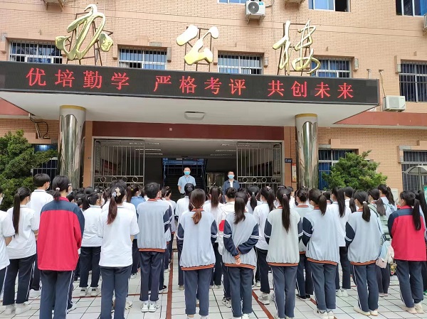 考试当天,考务人员和考生全程佩戴口罩,工作人员做好体温检测工作。考试过程中,校长骆登宇、副校长李振华在教务科许显坤主任的陪同下,巡查考评工作。考生严格遵守考试规则,认真思考,安静沉着答题,整场考试流程清晰、有条不紊。